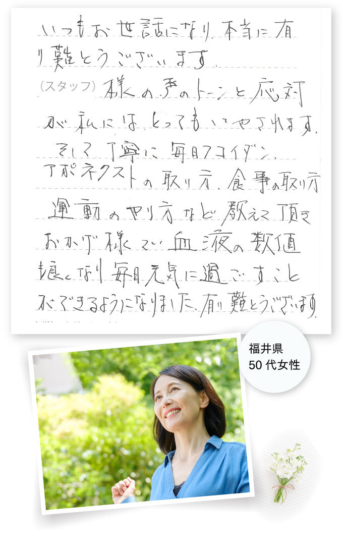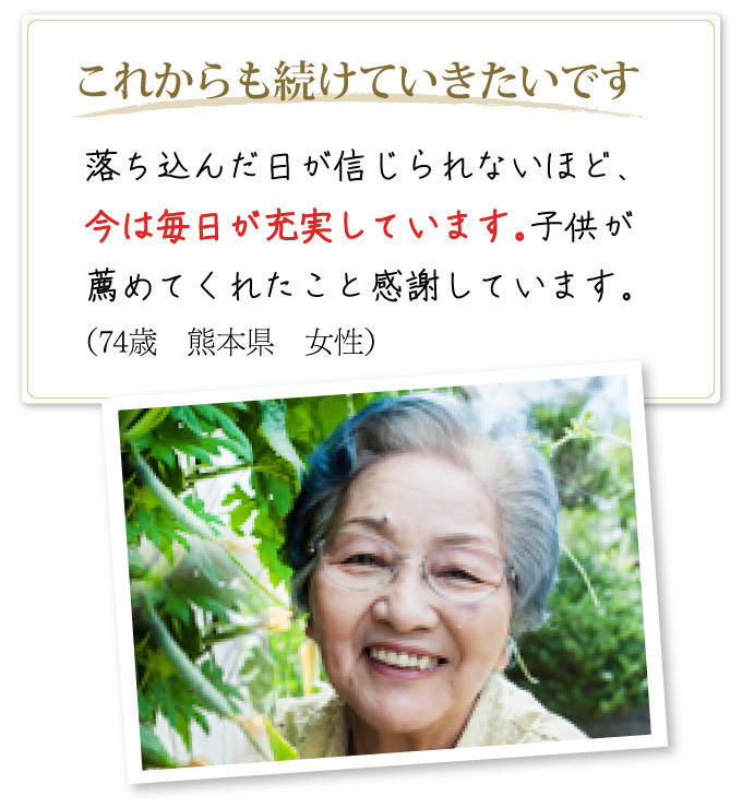 「最近では、お友達と温泉に出掛けたりと外出を楽しむようになって、以前と変わらないですね。子どもたちからも『お母さんにフコイダンを飲んでもらって本当によかった』って。本当にありがとうございました」とのこと。