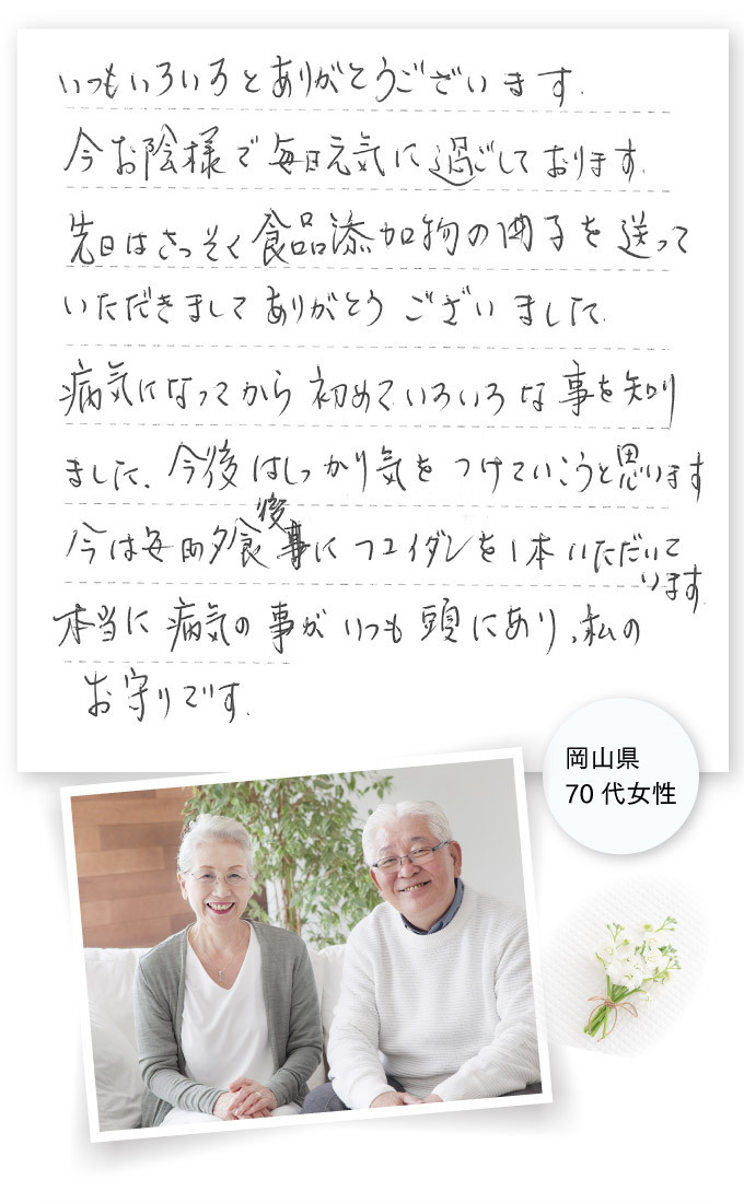 山田様はフコイダンを飲み始めて食事が美味しく食べられるようになってからは、以前と変わらぬ笑顔を取り戻されました。その後は定期的な健診を受けており、その結果も良好なのだそうです。