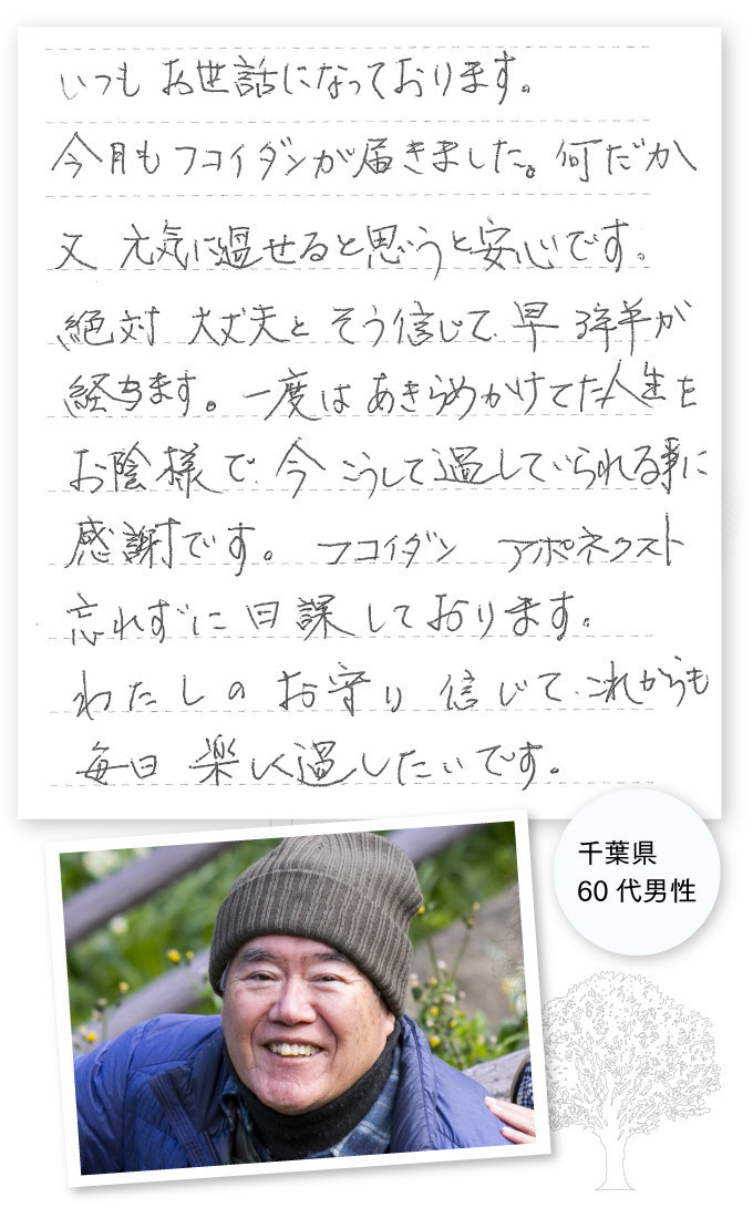 「元気に過ごしています。これもフコイダンのおかげです。周りの方からは、『大変だったようにはとても見えないね。どうしてそんなに元気なの!?』とよく驚かれるんですよ。」と嬉しそうにおっしゃっていました。