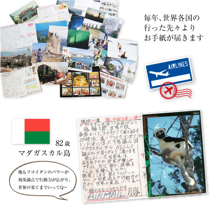 毎回海外旅行へも欠かさずフコイダンだけは持っていただいている赫多様。そしてスペイン、スイス、メキシコなどなど世界各地から私どもへエアメールを送ってくださいます。その数はもう今年で20枚を超えました。旅先での様々な体験記、本当にありがとうございます!